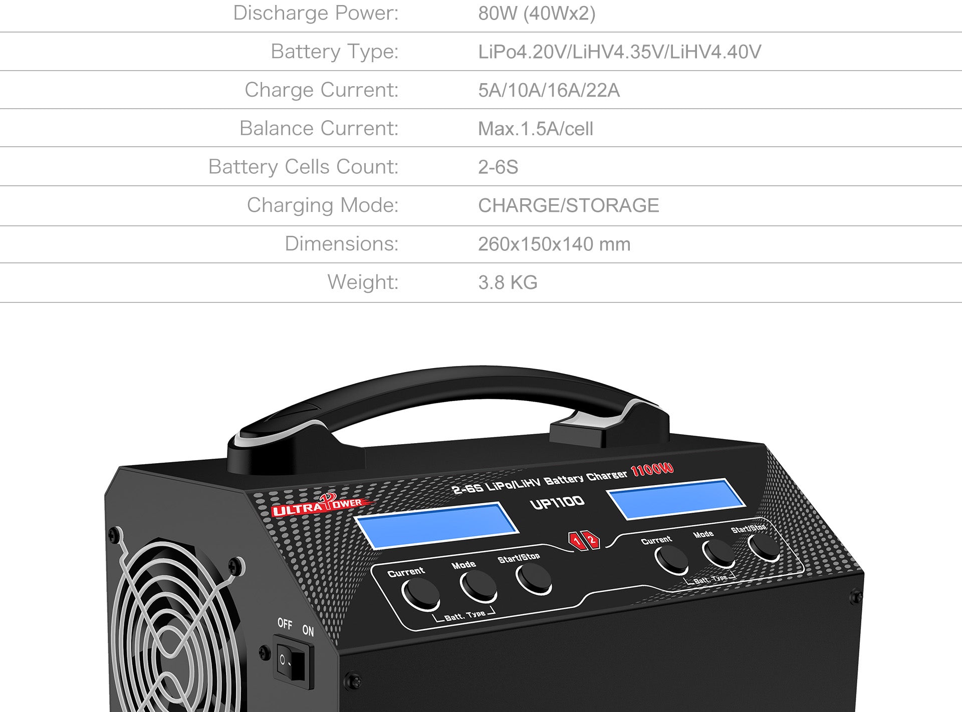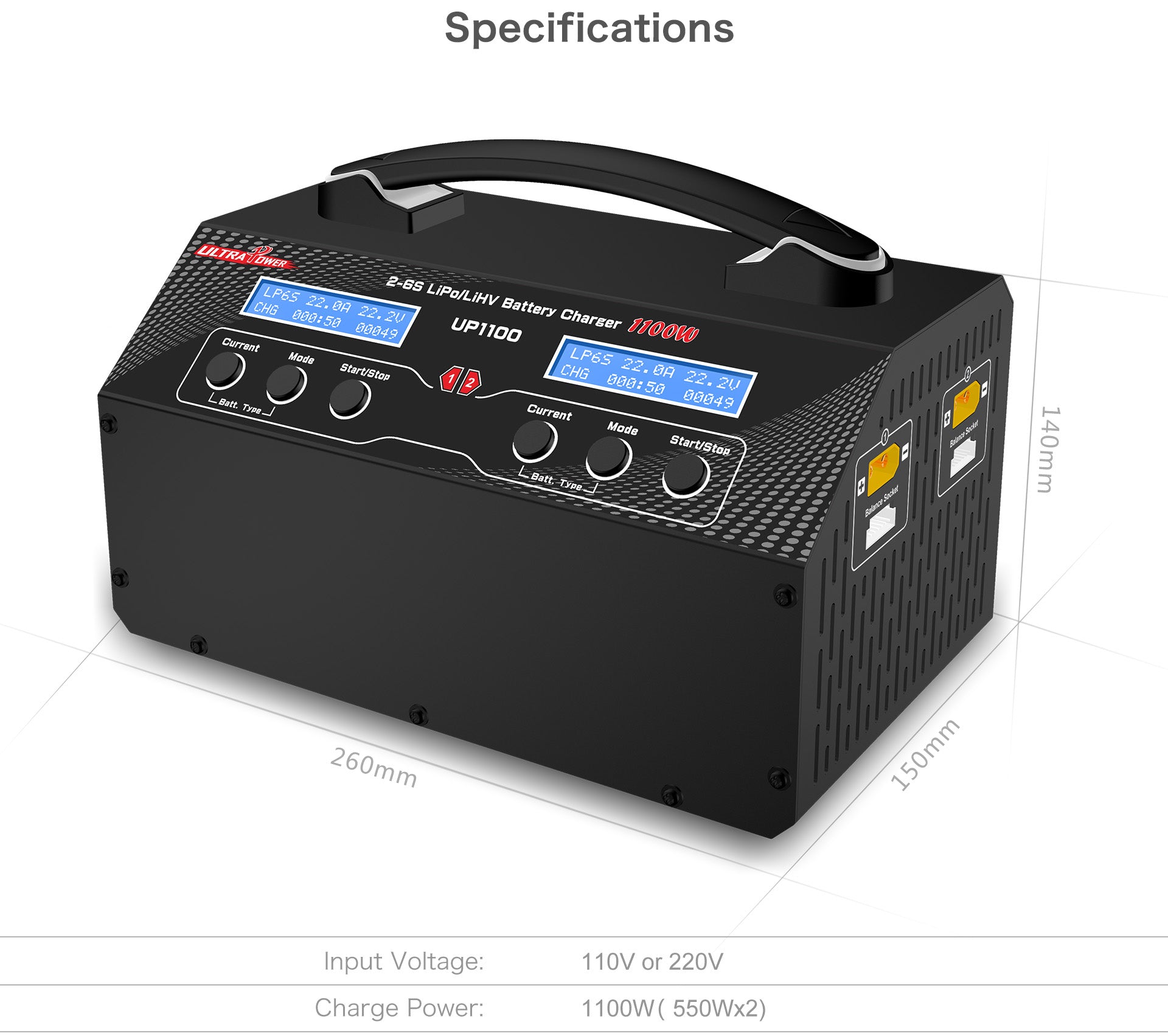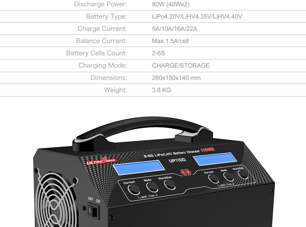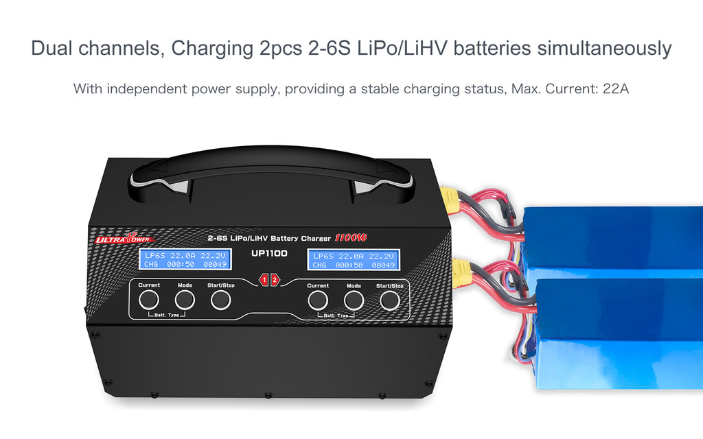 Il Caricabatterie UP1100 è progettato per offrire prestazioni elevate e affidabilità nella ricarica di batterie LiPo/LiHV da 2S a 6S, rendendolo perfetto per droni professionali, UAV e modellismo avanzato. Con due canali indipendenti da 550W/22A, consente la ricarica simultanea di due batterie ad alta velocità, riducendo notevolmente i tempi di attesa.